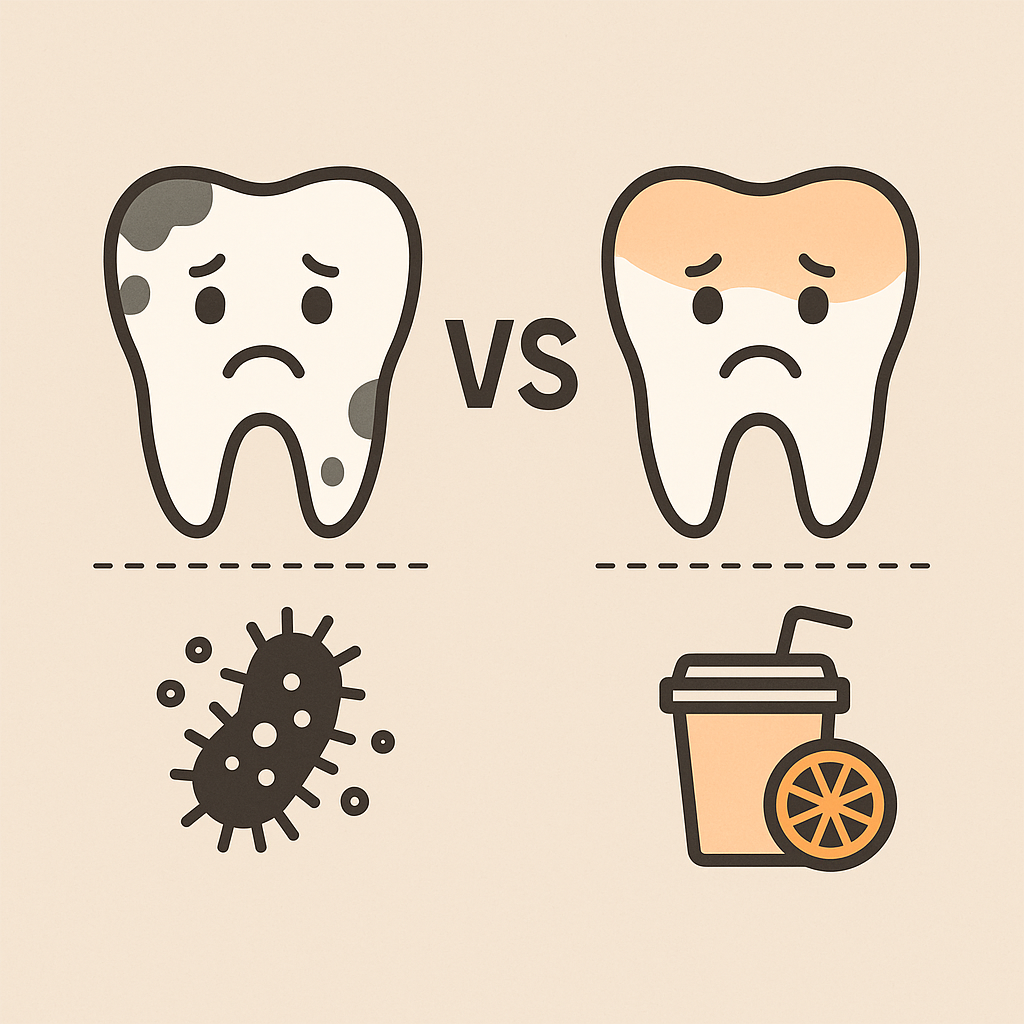 酸蝕症と虫歯は“歯が溶けていく”という点では似ていますが、原因は異なります。